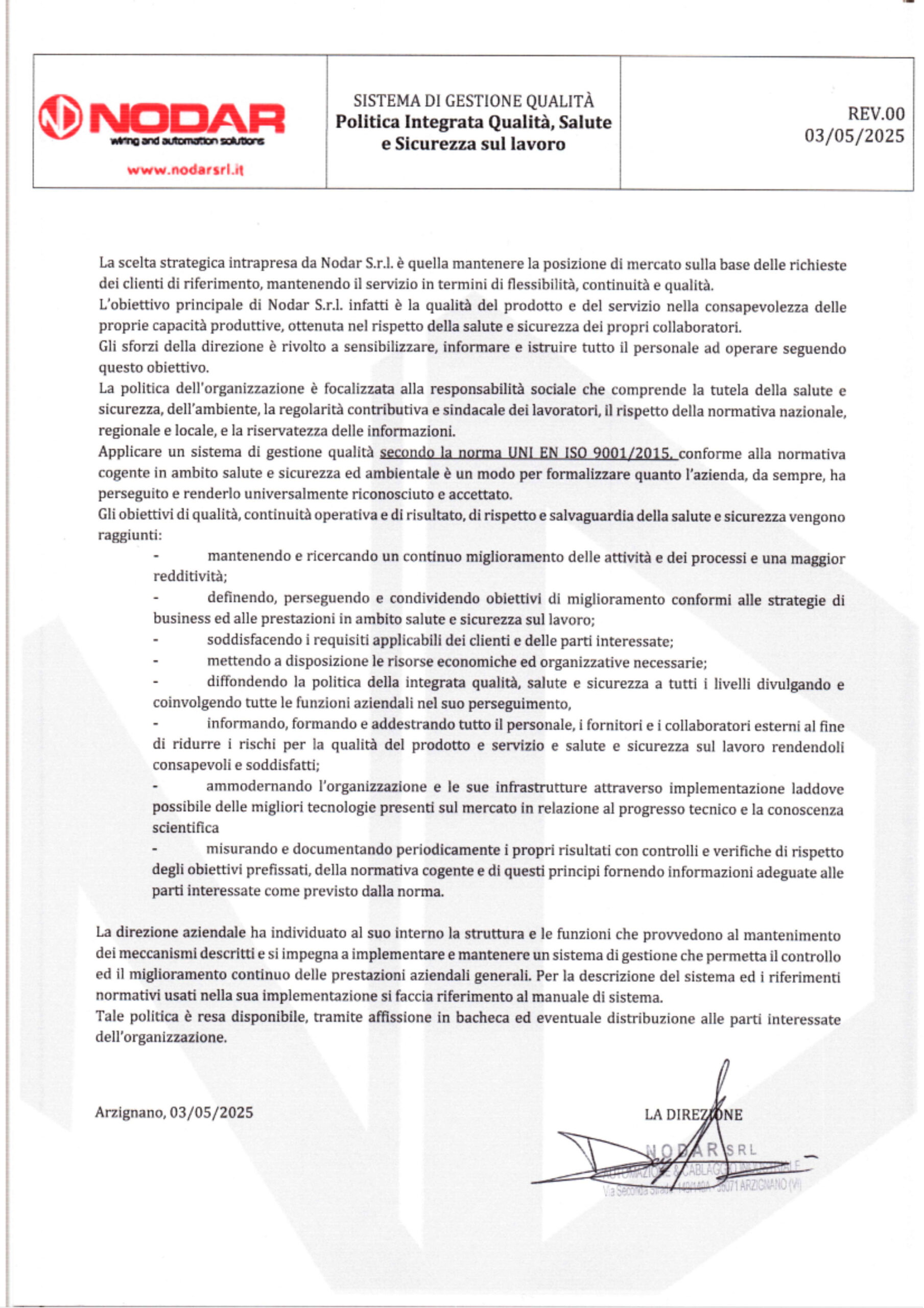 La Politica Integrata di Nodar Srl definisce gli impegni su Qualità, Salute e Sicurezza sul Lavoro lungo l’intero ciclo di progettazione e costruzione dei quadri elettrici. Mettiamo al centro la soddisfazione del cliente, il rispetto della normativa, la prevenzione dei rischi, la formazione continua e il miglioramento costante dei processi.
